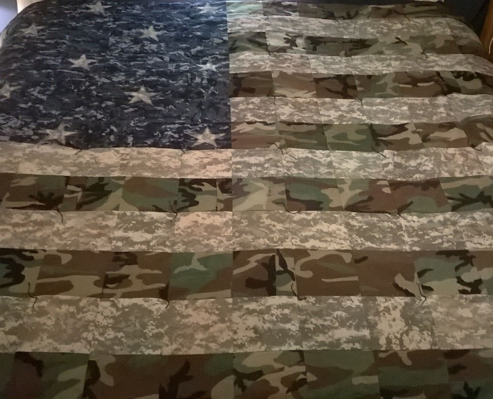 I grew up and joined the Navy Seabees. I was deployed to Falujah, Iraq in 2005 for 7 months. While I was there, the band Rascal Flatts came and did a U.S.O. tour for the troops. There were about 300 of us there. There were guns everywhere, of all kinds. And there were Army, Navy, Air Force, and Marines there all together singing "Mayberry". We were a dancing, moving sea of camouflage. After the concert, I remembered the blanket that my grandma made out of farmers jeans and thought if I ever get home from here, I want to make an American Flag Blanket out of soldiers uniforms from all the branches of the military to represent all the branches serving America. So I did.